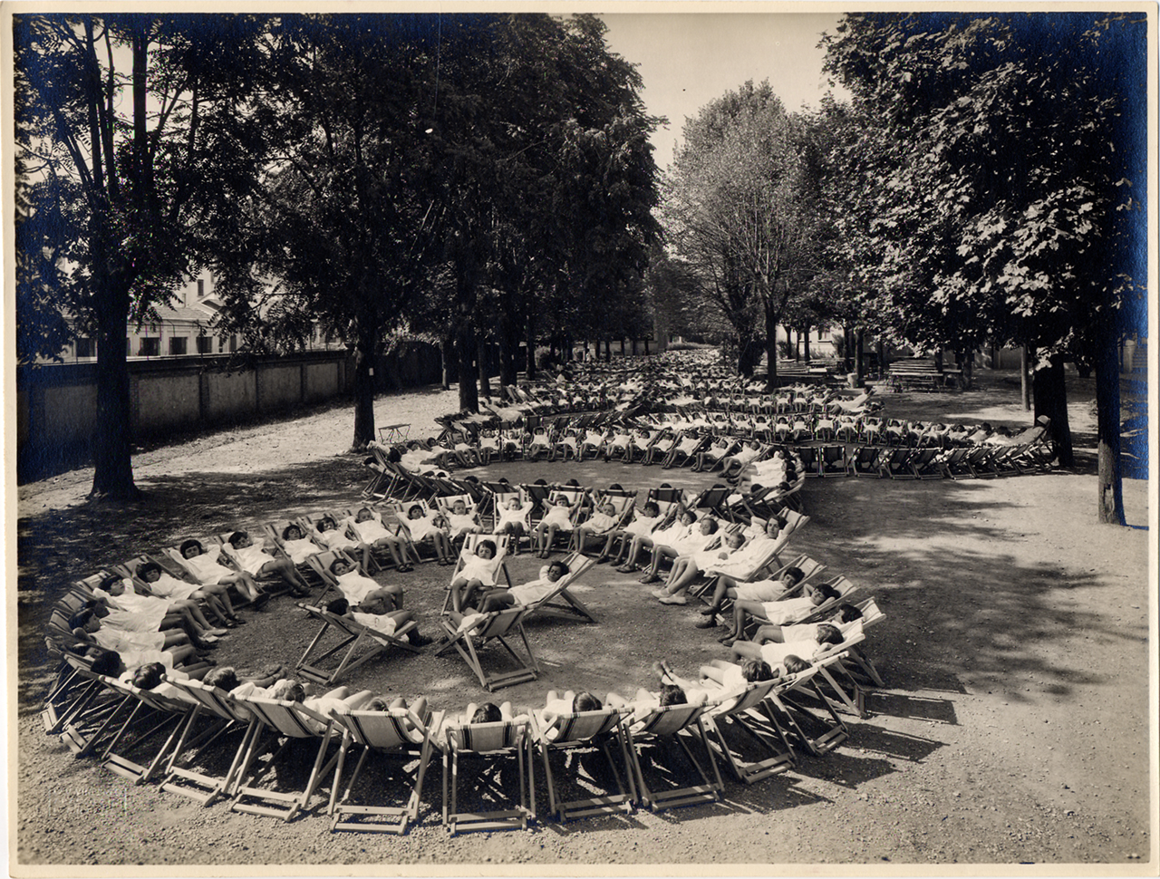 I bagni di sole dei bambini presso il giardino della Scuola all'aperto “Umberto di Savoia”, 1929. Foto di Vincenzo Aragozzini (Archivio ASP Golgi-Redaelli, Milano)