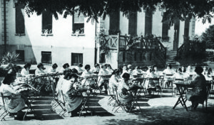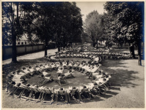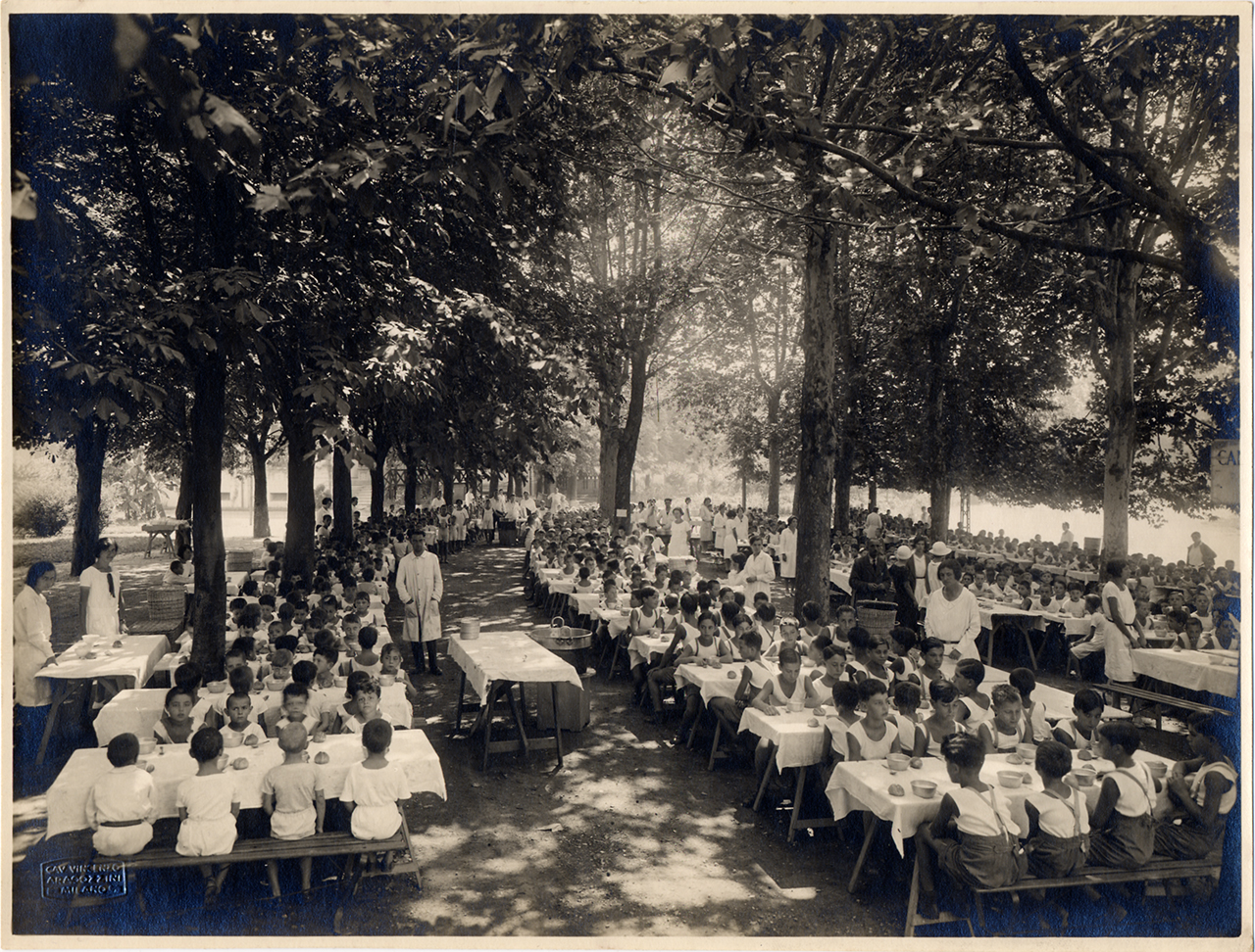 Il pranzo degli allievi nel giardino allestito con i tavoli del refettorio del convitto presso la Scuola all'aperto “Umberto di Savoia”, 1929. Foto di Vincenzo Aragozzini (Archivio ASP Golgi-Redaelli, Milano)
