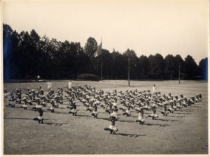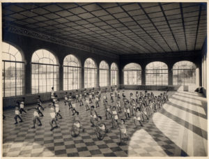 Esercizi di ginnastica degli allievi della Scuola all'aperto “Umberto di Savoia” negli spazi dell’ex Trotter, 1929. Foto di Vincenzo Aragozzini (Archivio ASP Golgi-Redaelli, Milano)