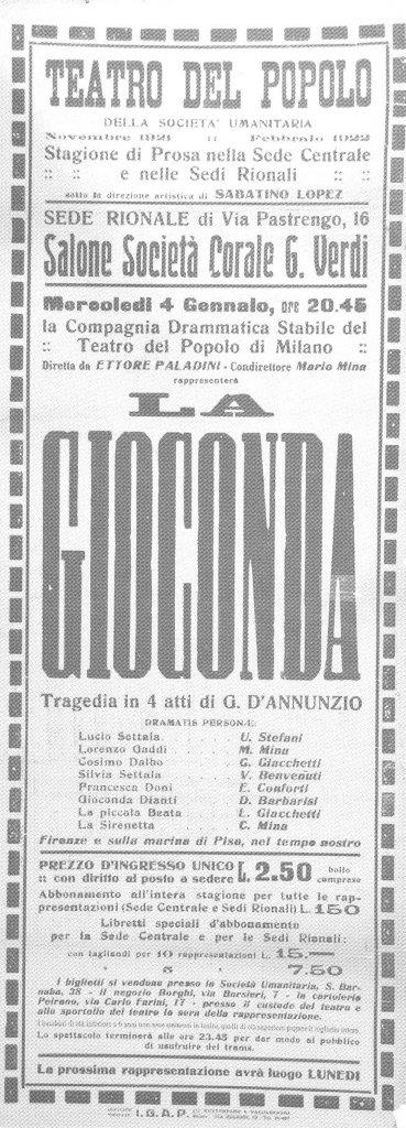 Sui palcoscenici rionali teatro di prosa, teatro di poesia, sono entrambi accolti, sentiti, gustati. La figura mordente e dolorante di Giannetta nella Cena delle Beffe, l’impotenza paterna a distogliere i figli in Come le foglie, l’angosciata Maternità, la violenza di Bufere, dell’Imboscata, della Nemica, la delicatezza della Maestrina, la forza dell’Onore e di Casa paterna, la vicenda umanissima del Romanzo di un giovine povero, tutto è compreso e sentito. E se, talvolta, il palcoscenico non permette vasto movimento, tuttavia il pubblico ne comprende le relative manchevolezze e le scusa poiché comprende che è nei voti del Teatro del Popolo creare altri più vasti ambienti, perché a tutta la folla che lavora giunga il conforto e la gioia dell’arte”.